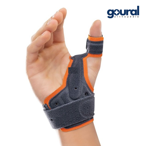 Thumb splint with removable, cold-formable stay, made of soft elastic fabric and Velcro closure.
