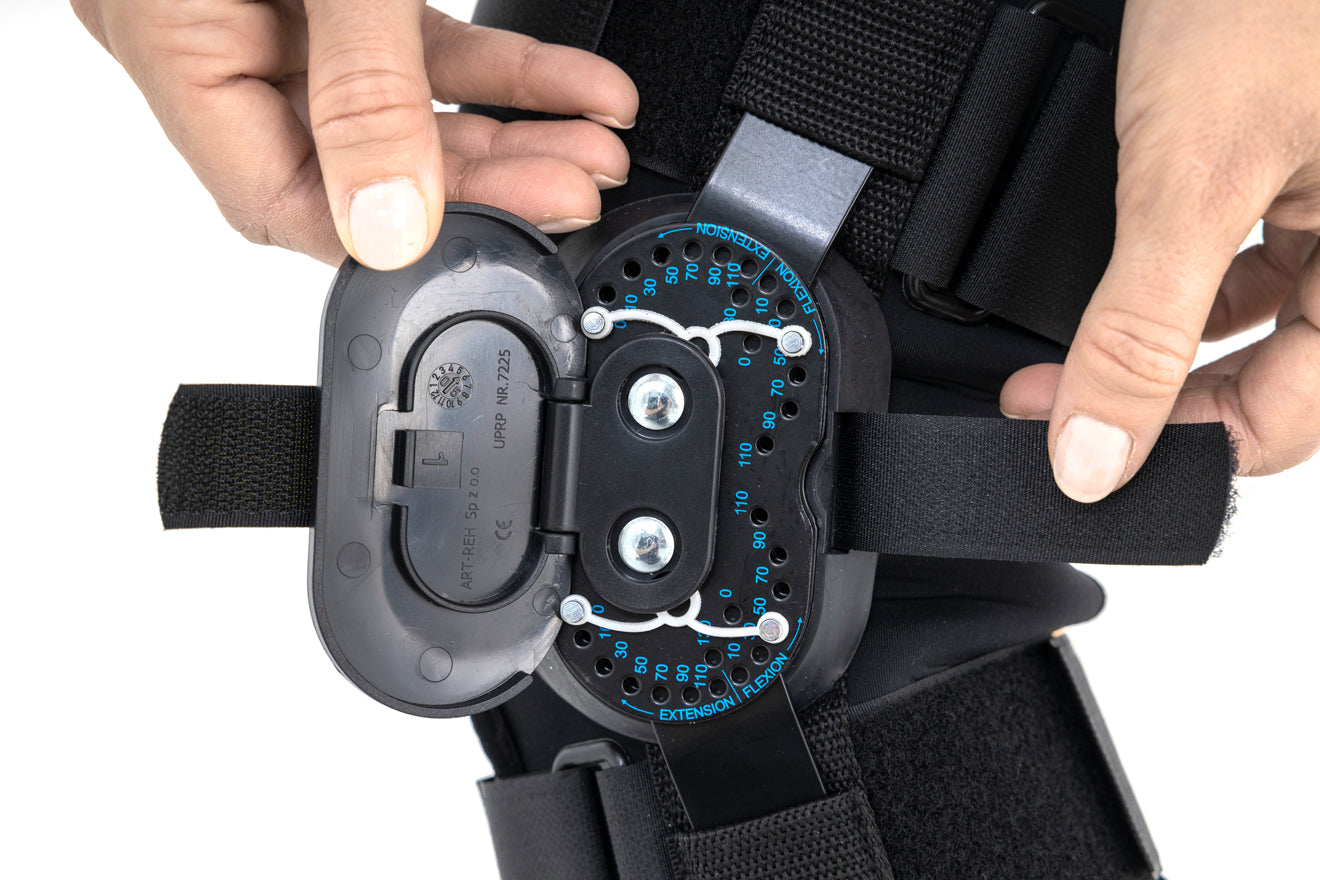 2R braces - Polycentric double-axis braces, with a rack that reflects the anatomical movement of the knee. These braces are used in all knee joint orthoses where, in addition to angle adjustment, lateral joint stabilization is also important. The braces are made of high-quality aluminum alloy, with a sanded and durable coating, neutral to the influence of sweat and salt. The required flexion and extension angle every 20o is adjusted using special pins. The braces are equipped with special oval covers that prevent the pins from falling out and unauthorized persons from changing the angle. The standard length of the braces is 390 mm, but longer braces are additionally equipped with lateral stabilization of the knee joint. The brace and its design are patented in the European Union.