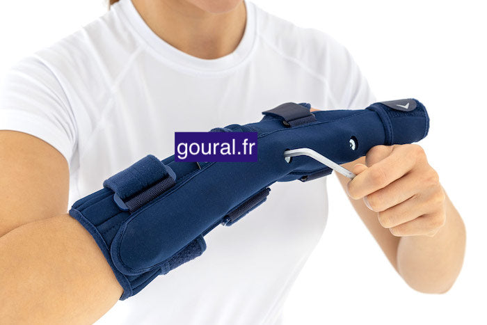 L’orthèse est équipée d’une attelle faite de polyamide avec ajustement ROM. L’ajustement est possible, grâce à la clé Allen.