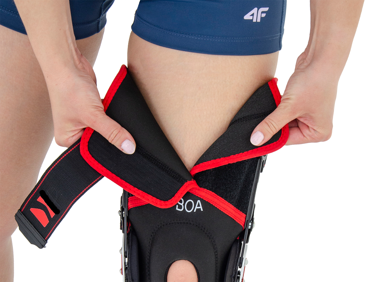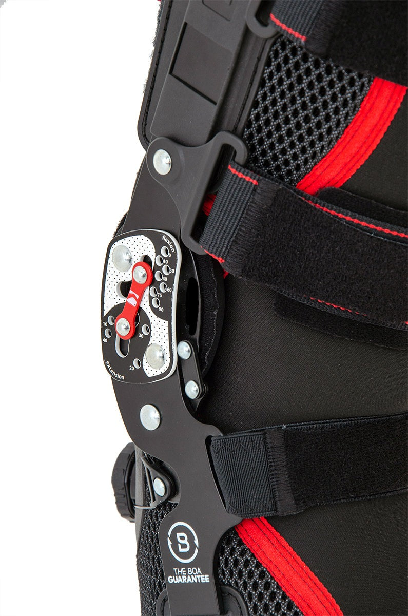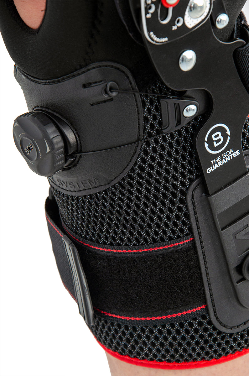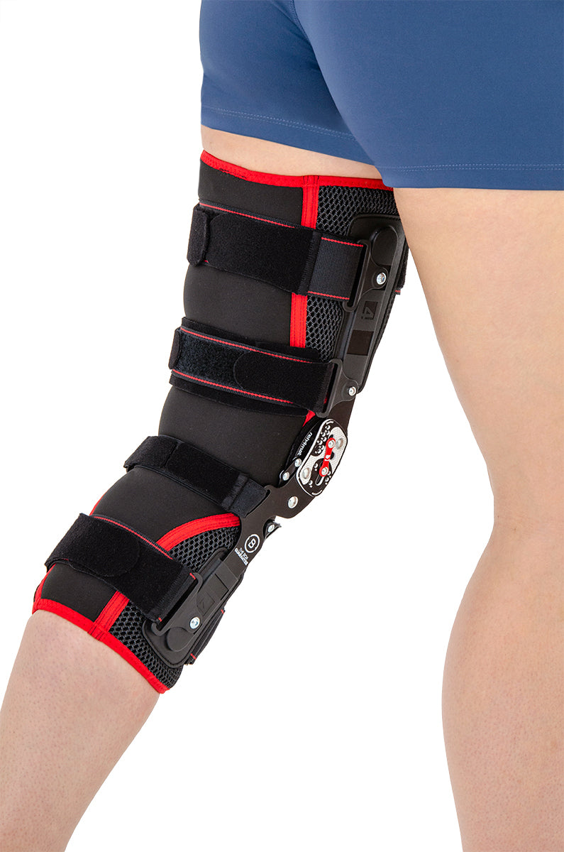 Le dispositif est équipé d'ensembles indépendants de sangles Velcro, d'un support dynamique du LCA et d'attelles latérales anatomiques à 2 axes 2RA-ACL. Les attelles ont été équipées d'un verrou de chute 2RA, qui permet d'ajuster la ROM (flexion à 75°, extension à 15° et immobilisation à 0°). En outre, l'attelle comprend le système de précision ACL, qui est un support innovant pour le ligament croisé antérieur (LCA), qui, en cas de blessure, minimise le syndrome du tiroir antérieur non requis.