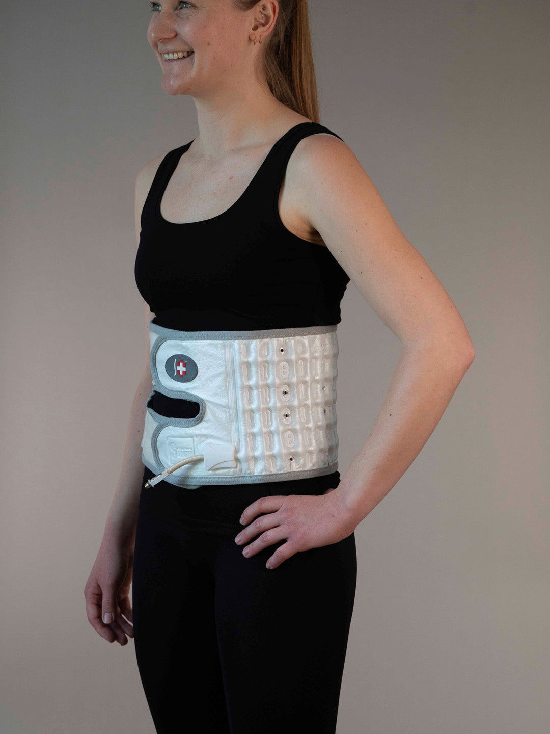 L’orthèse Air Traction Belt fonctionne avec des tubes d’air gonflables verticaux qui se prolongent lorsque l’air est pompé, de sorte que la colonne vertébrale dans la zone lombaire s’étend. Les disques intervertébraux, les articulations intervertébrales et les nerfs sollicités sont soulagés et la douleur réduite.