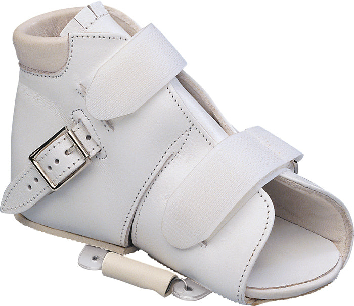 L'orthèse de pied bot et de pied falciforme pour bébés est une orthèse corrective en forme de chaussure fabriquée en cuir souple. Pour permettre une correction variable, la semelle de l'orthèse est divisée en deux parties. L'arrière du pied est soutenu par une talonnette, tandis que la correction du désalignement de l'avant-pied se fait par la mise en place d'un ressort de tension sur l'autre bord du pied, dans la région de l'articulation de Lisfranc. La fixation à l'articulation du gros orteil et à la zone de l'os cuboïde sur le bord extérieur du pied guide l'avant-pied dans la position corrigée. L'orthèse est principalement utilisée pour les nourrissons et les jeunes enfants à l'âge de la crèche. Par la suite, des attelles de nuit peuvent être utilisées si un traitement correctif supplémentaire du mauvais alignement de l'avant-pied est nécessaire.