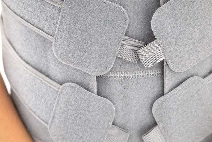 Une fermeture asymétrique permet un ajustement parfait sur le corps du patient. Le panneau de fermeture est fait de velcro stratifié avec mousse semi-rigide confortable situé à l’intérieur, en outre fourni avec deux élastiques whalebones. Le système GRIP OPEN facilite l’assemblage et le démontage de l’orthèse.