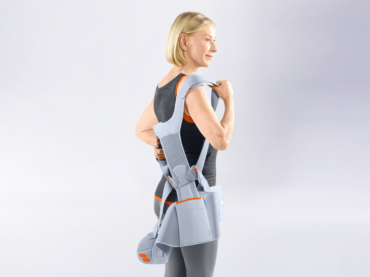 L'orthèse est facile à mettre et à enlever grâce au principe du sac à dos. Sur le dos se trouve un rail télescopique dynamique et inclinable avec un effet de ressort qui s'adapte aux mouvements du corps. Lorsque le haut du corps est penché vers l'avant, le rail inclinable extensible se déploie et reprend sa position initiale lorsque le haut du corps se redresse. Le guidage de la sangle par les boucles de guidage minimise la force nécessaire à la mise en place de l'orthèse. Le textile élastique et respirant garantit un excellent confort de port. Un code QR directement sur le produit permet d'accéder à des exercices thérapeutiques et à des informations importantes pour le patient.