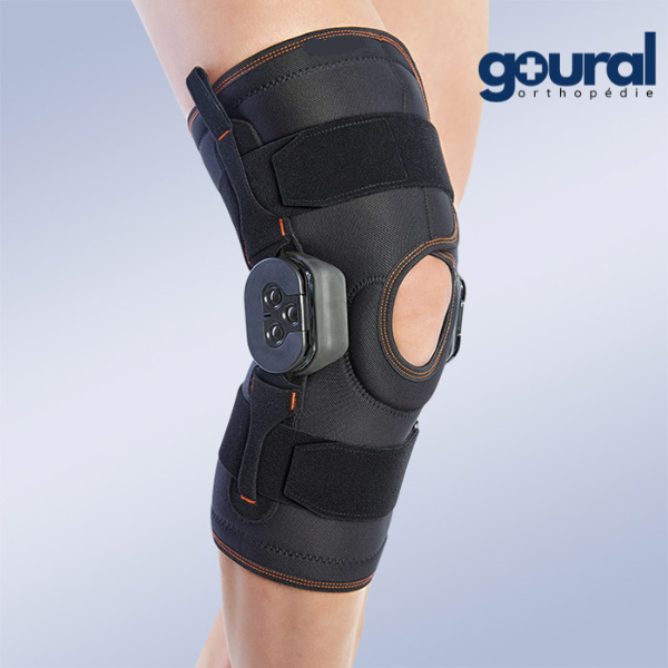 Articulation polycentrique avec 0-15-30-60-90° en flexion-extension, coussinet rotulien sous le genou.