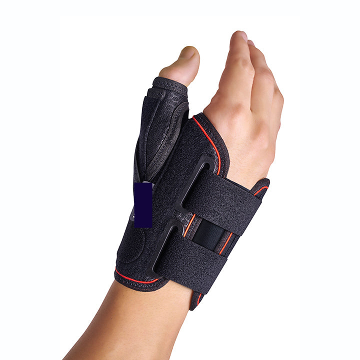 Il est doté d'une attelle d'abduction du pouce en aluminium malléable, d'un élastique en Lycra à l'arrière pour une mise en place facile et de fermetures Velcro avec boucles.