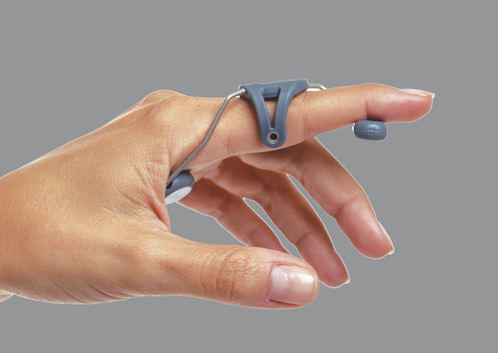 Orthèse enveloppante dynamique de mise en extension du doigt type Capener FingerExt pour le traitement des flessum. Facile à mettre et confortable.