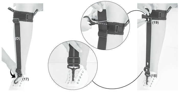 La version plus inclus un releveur de pied. Un élastique réglable en tension se fixe par vos soins sur la sangle (sous le genou) et est relié à l'avant de la chaussure comme les RDP (par des petits serflex, crochets... en option).