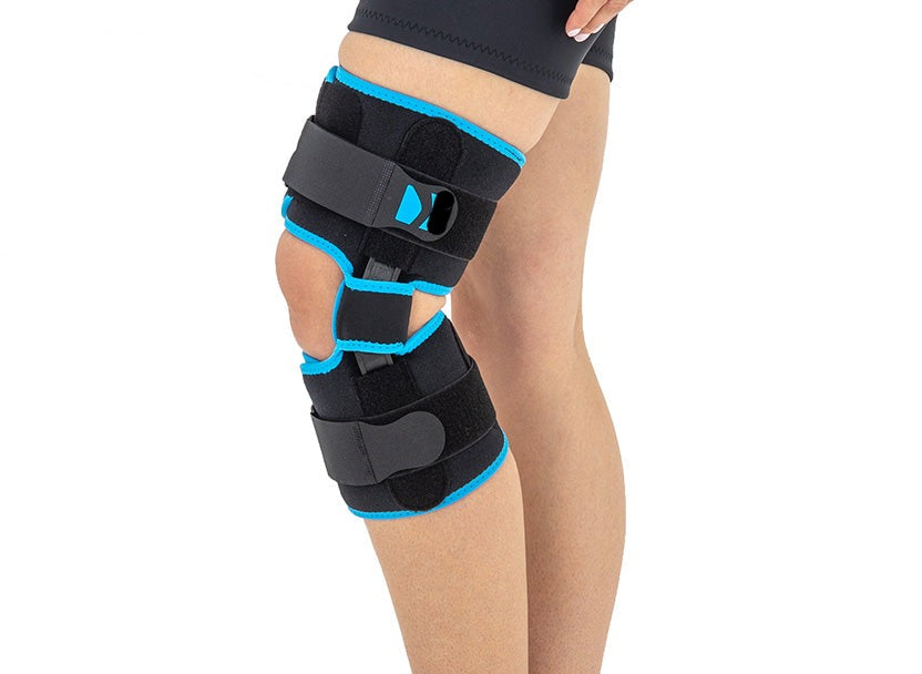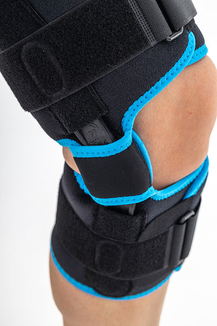 De plus, l'orthèse est équipée d'une charnière légère et de deux attelles latérales 1R en plastique. Les attelles permettent d'ajuster l'amplitude de mouvement tous les 15 degrés et d'immobiliser le genou si nécessaire.
