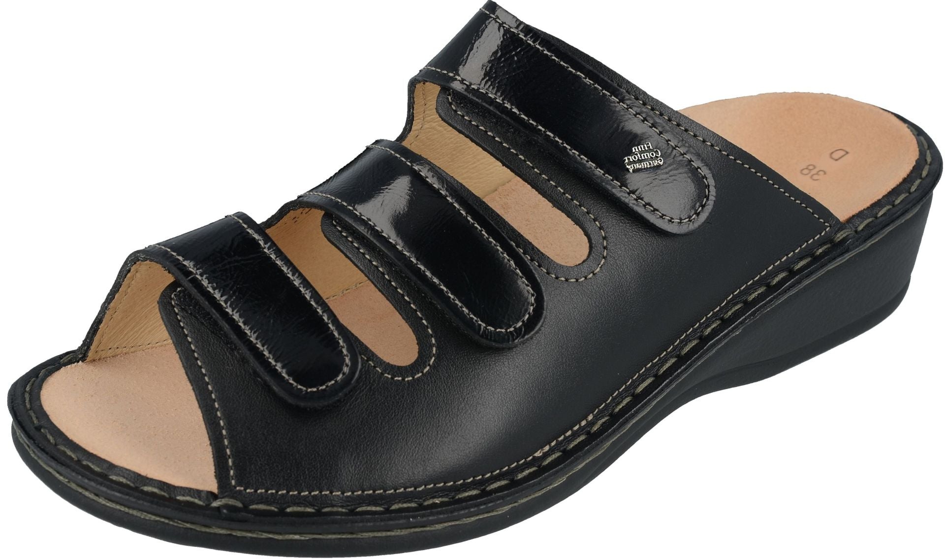 Calez bien votre talon dans la cuvette talonnière de la semelle Finn Comfort - à la limite de celle-ci. Votre voute plantaire doit se positionner naturellement et parfaitement. Ajuster vos brides et mettez vous debout. Votre orteil le plus long doit venir à la limite de la couture, voire 3 à 5 mm en retrait.
