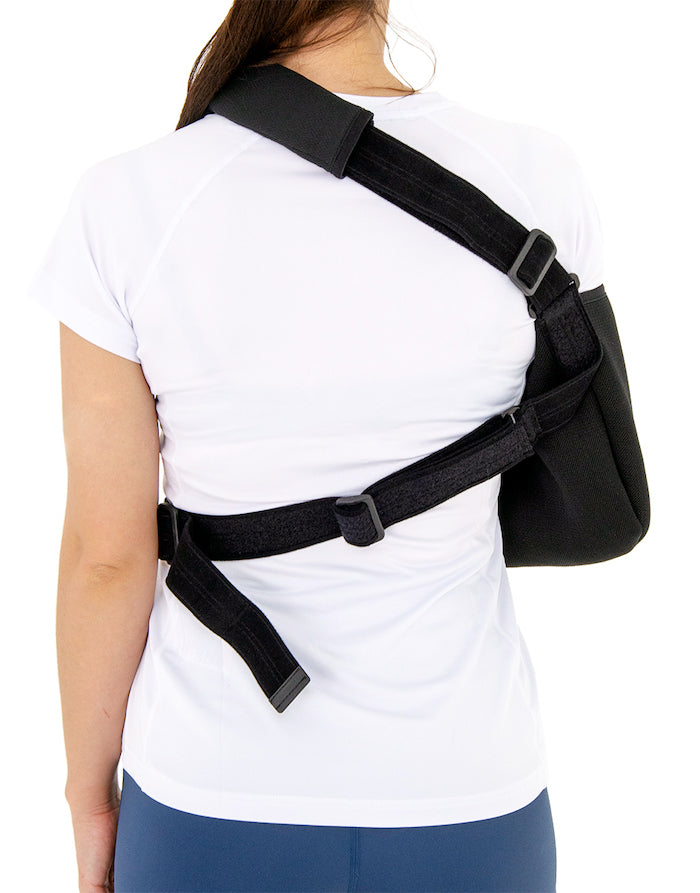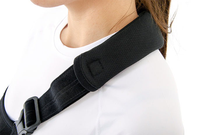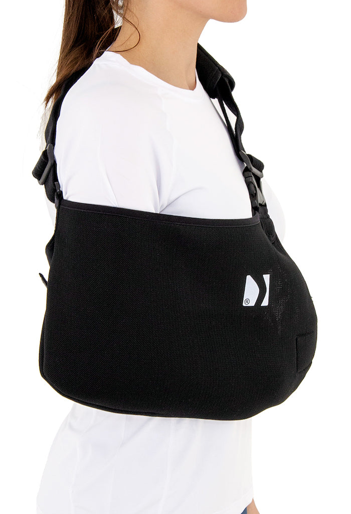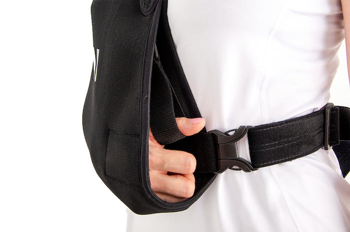 Nous avons conçu cette écharpe pour qu'elle puisse se mettre en place facilement et sans douleur (sans avoir à relever le bras pour passer la sangle par dessus la tête).