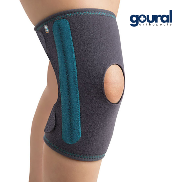 Genouillère de maintien du genou pédiatrique avec fenêtre rotulienne et stabilisateurs latéraux.