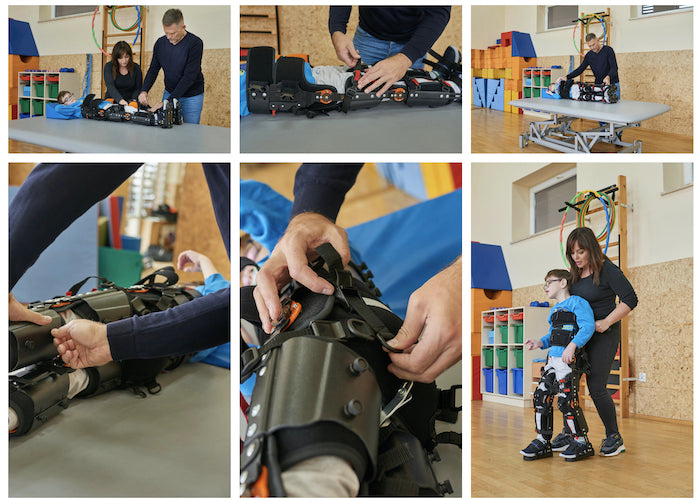 Des poignées spéciales, faciles à retirer, sont fixées au panier de la hanche, ce qui permet au soignant d'attacher plus facilement l'enfant lorsqu'il utilise l'orthèse.