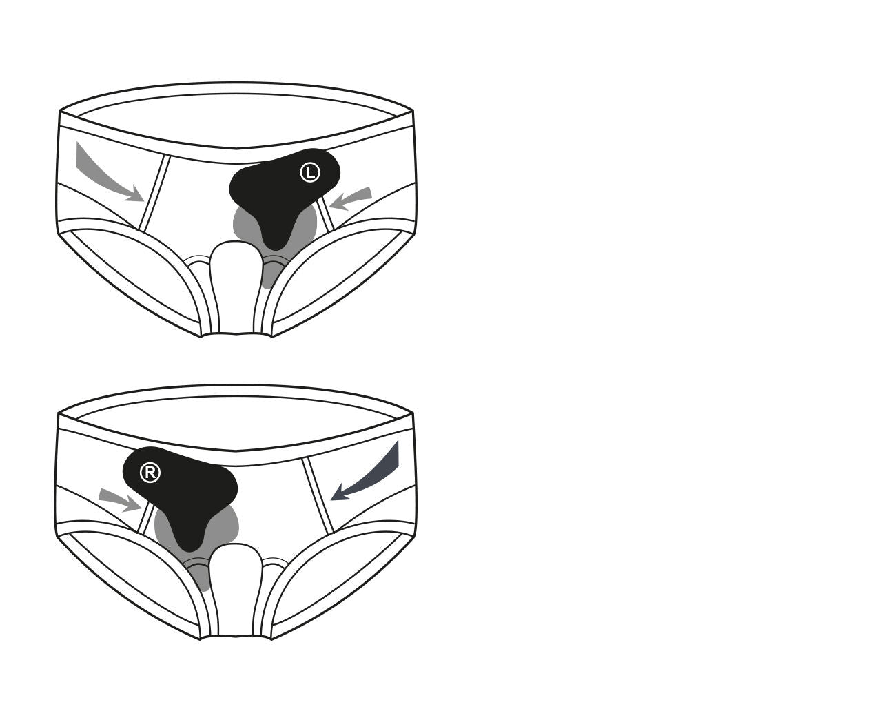 Portez directement sur la peau ; Placez l'arrière du slip plus haut que l'avant ; Placez les coussinets dans les poches internes.